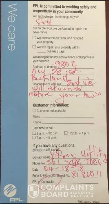 Florida Power & Light [FPL] — fpl drove over my septic drainfield months ago and I havent heard back from them