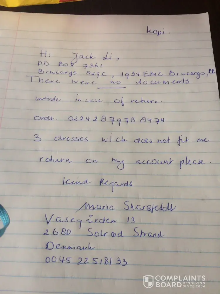 The 3 three dresses were not fitting and of low quality so not my choice and waiting for a response! Now again Sending a copy of return from danish post from May 2019 and still waiting ! Order nr. [protected], kind regards Maria Skarsfeldt