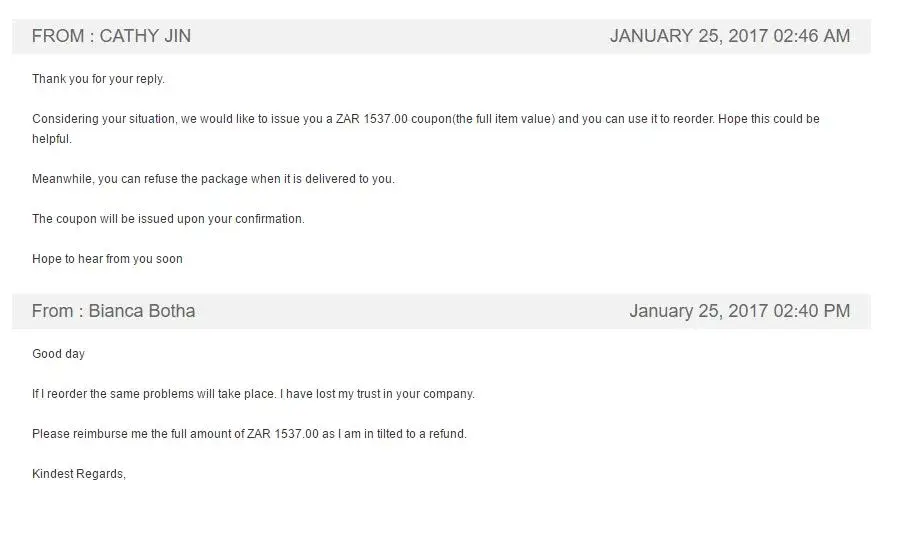 JANUARY 25, 2017 02:46 AM Cathy replied me informing me that they would give me a coupon valid of the full amount I purchased in the items I was suppose to get. But I replied telling her I am entitled to get a full refund on the January 25, 2017 02:40 PM.