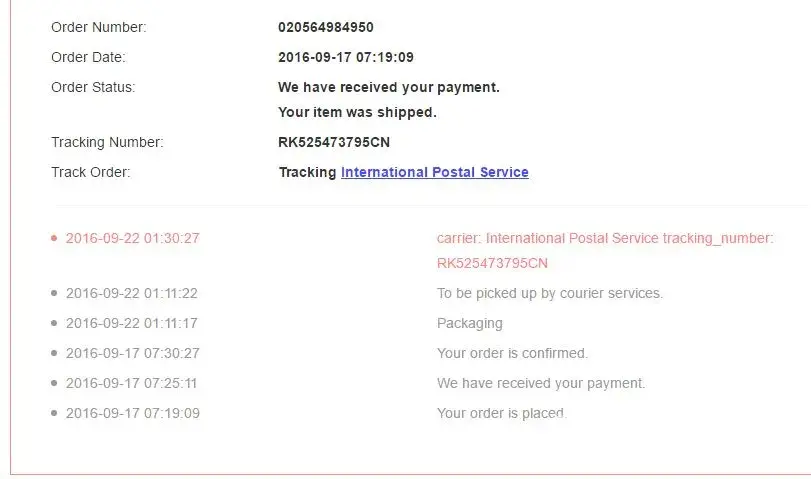 On the 17th of September 2016 I ordered a dress and a handbag, I paid an additional amount to get it in 7 working days. The date today is 01/02/2017 - still no package has been received by me which was ordered in August 2016.