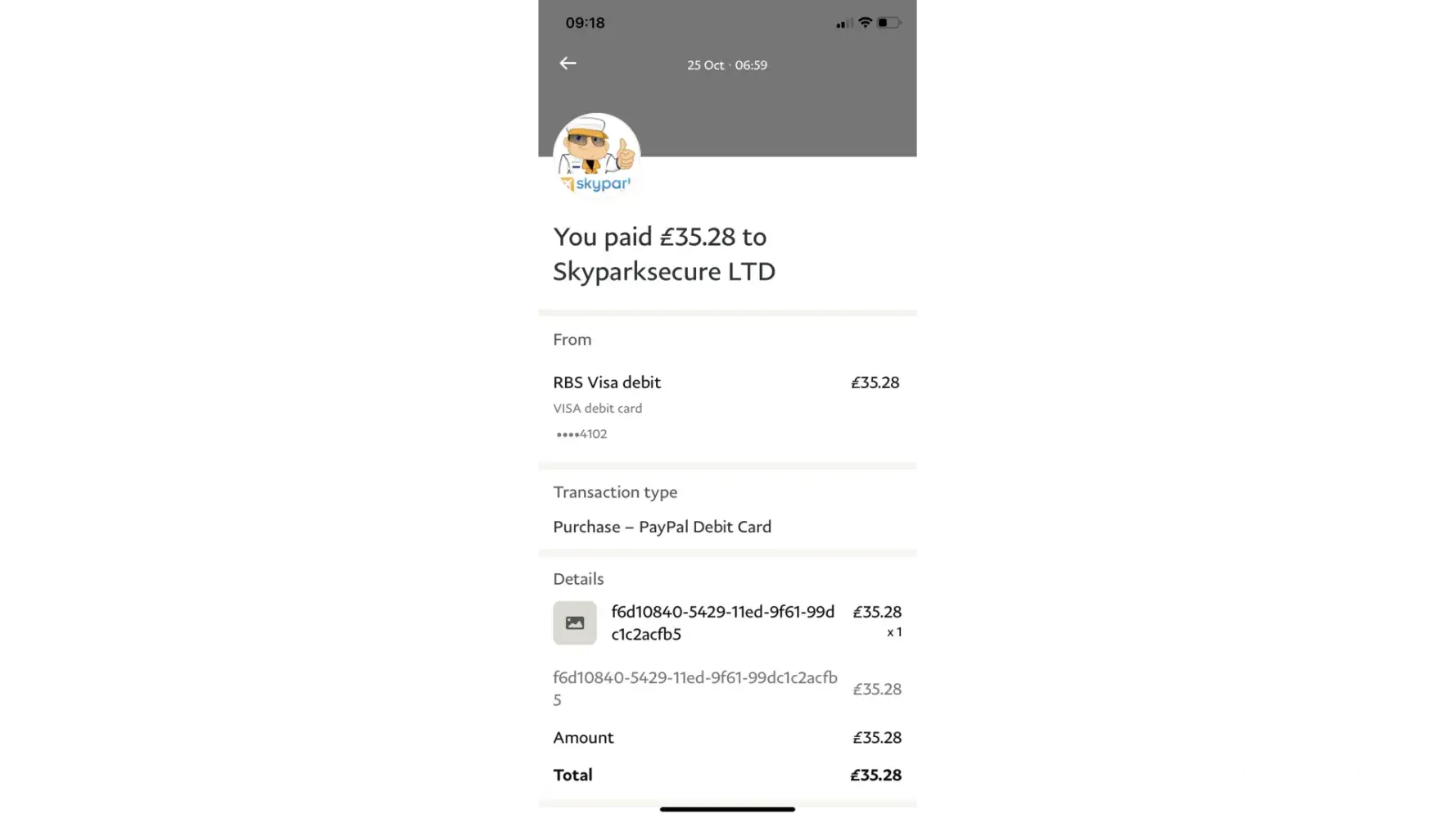 35.28 - SkyParkSecure ltd airport parking at Glasgow, booking ref [edited]