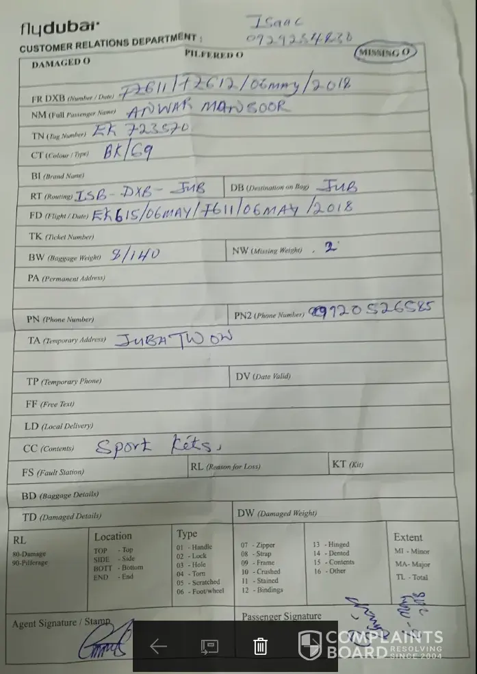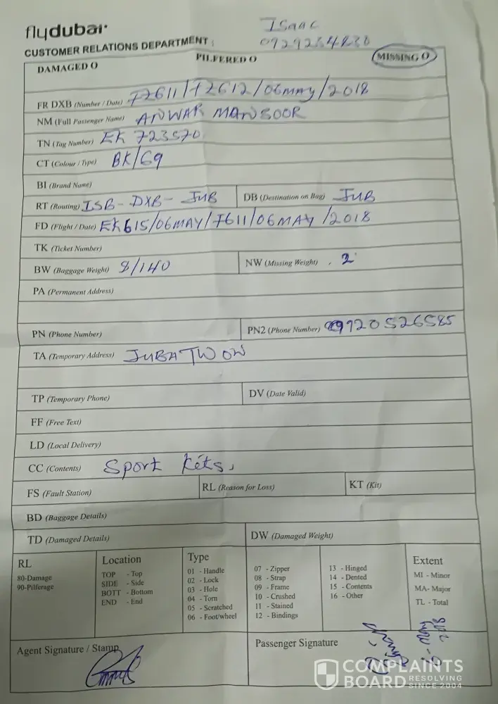 Dear Fly Dubai colleague: This is Muhammad Israr a frequent traveler on Emirates and Fly Dubai. I traveled on Emirates and Flydubai on date 6 May 2018, booking reference EK/LEMD86 from Islamabad to Juba. while check in we did a group check in with the name of my colleagues Mansoor Anwar, reaching Juba, I found one baggage missing comprised of sports item. I...