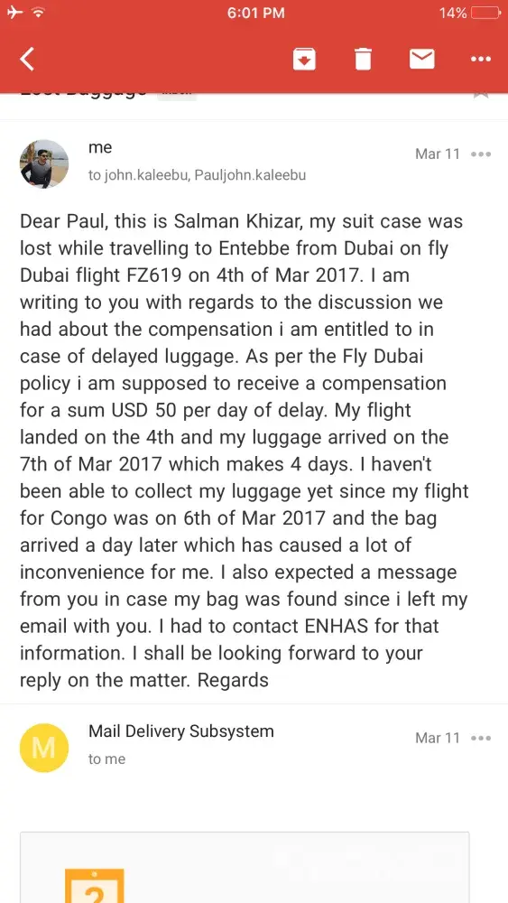 This is Salman Khizar, my suit case was lost while travelling to Entebbe from Dubai on fly Dubai flight FZ619 on 4th of Mar 2017. As per the Fly Dubai policy i am supposed to receive a compensation for a sum USD 50 per day of delay. My flight landed on the 4th and my luggage arrived on the 7th of Mar which makes 4 days. I was not able to collect my luggage on the 7th of Mar as i had to fly to Congo on 6th of Mar and the bag arrived a day later which caused a lot of inconvenience for me. Moreover, the flydubai official (Jhon Kaleebu)present at Entebbe airport was very rude and not helpuful at all. Despite of sending several emails he did not bother to reply.I also expected a message from him in case my bag was found since i left my email with him but it didnt happen and i had to contact ENHAS for that information. On Asking for the compensation he said you are not entitled to any which is contrary to flyfubai policy. Will be looking forward to a suitable reply from yourside. Regards ([protected]@gmail.com)