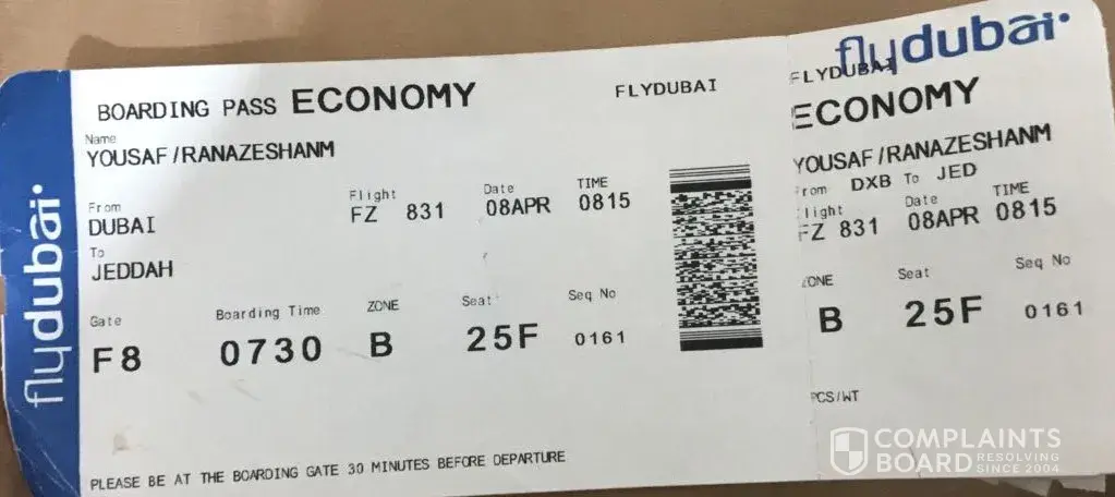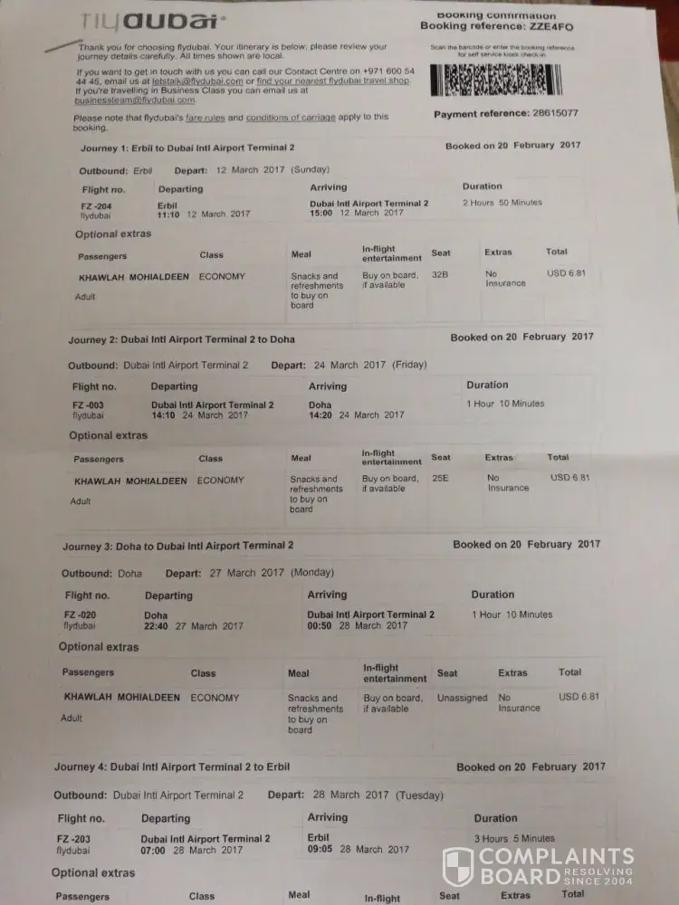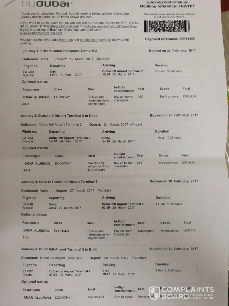 انا /المدعو عصمت الله Ù…ØÙ…د يوس٠لقد ØØ¬Ø²Øª تذكرة Ùلاى دبى بتاريخ22/04/2017 من كابل الى القصيم وقت الرØÙ„Ø© كانت 18Ùˆ15 دقيقه من كابل Ùˆ 1Ùˆ30 دقيقه من دبي الى القصيم لقد تاخرت الرØÙ„Ø© الى ساعة 1 ØµØ¨Ø§ØØ£ وصلنا الى دبى تقريبأ ساعة 3 ØµØ¨Ø§ØØ£ لقد طلبت من ÙØ±ÙŠÙ‚ Ùلاى دبى ÙŠÙˆÙØ±Ù„Ù‰ سكن Ø±ÙØ¯Ùˆ كلمت عدت اشخاص من موظÙين Ùلاى دبى رغم ذالك انا لقد اشتريت تذكرة بزيادة تقريبأ 70 دولار امريكى ØØªÙ‰ ما امن لى سكن كانت تذكرة على توق٠12 ساعة به 280 دولار Ùˆ اطالب بتعويض هذى رقم Ø§Ù„ØØ¬Ø² ZC4AAZ