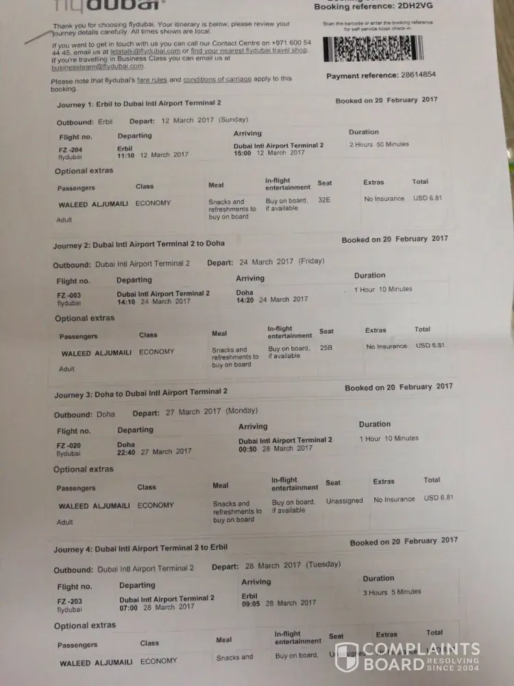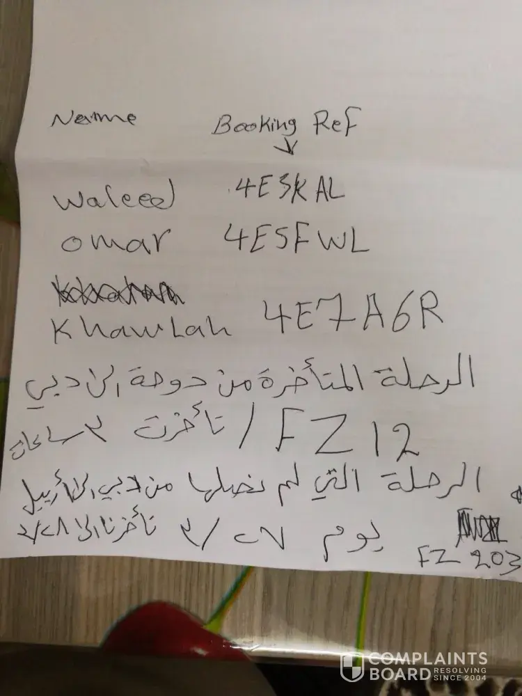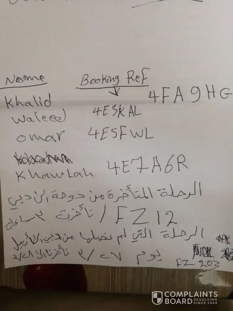 The flight from doha to Dubai the flight number FZ12 was delayed 3 hours on the 27th of March. The second flight from Dubai to Erbil on the 27th of march was delayed till the 28th of march. The flight number is FZ203. The name under these bookings was Aljumali Waleed and Mohialdeen Khawlah and Aljumali Omar and Aljumali Khaled. Also the names have been written so they are surname then forename.