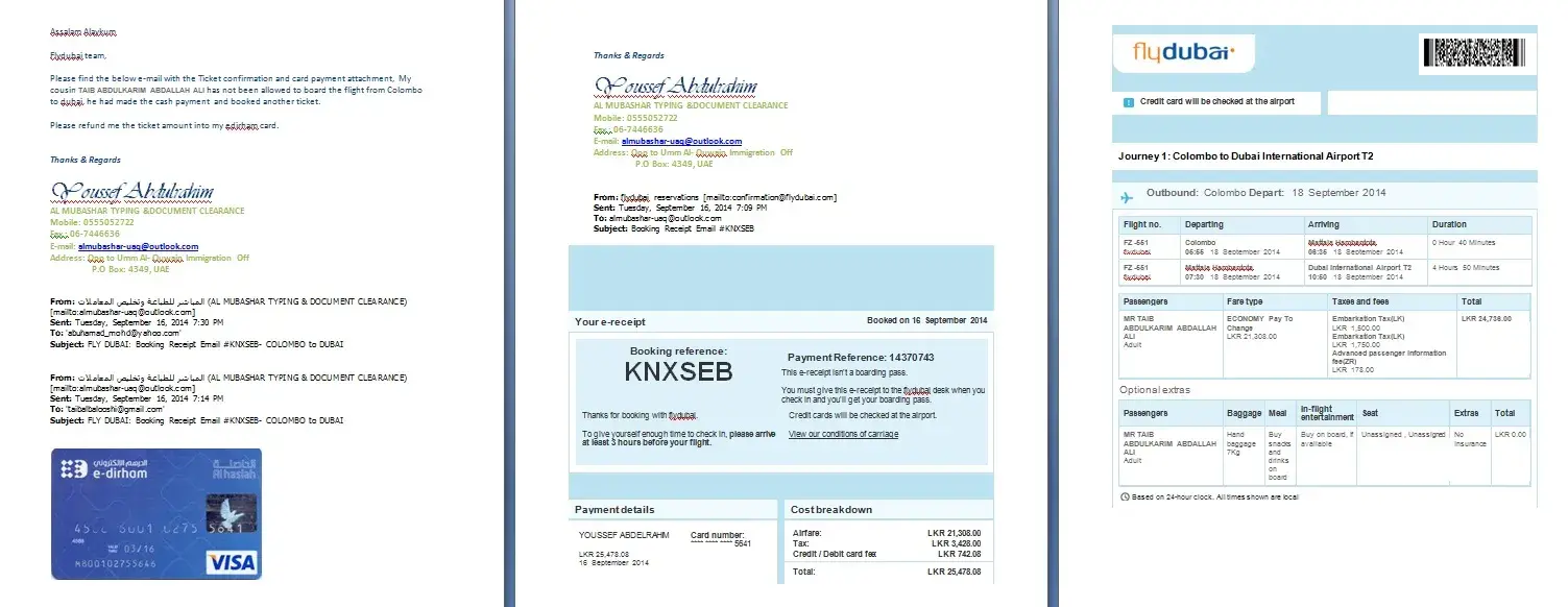 The flight from colombo to dubai, we made the online booking, and he also had the payment card copy details,