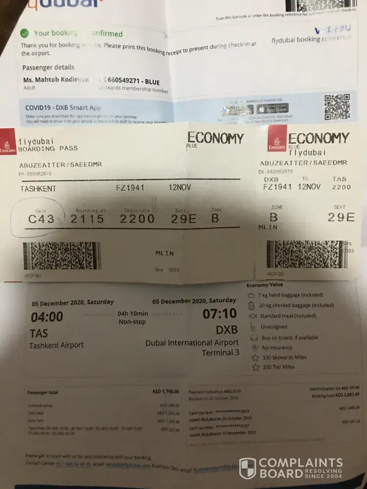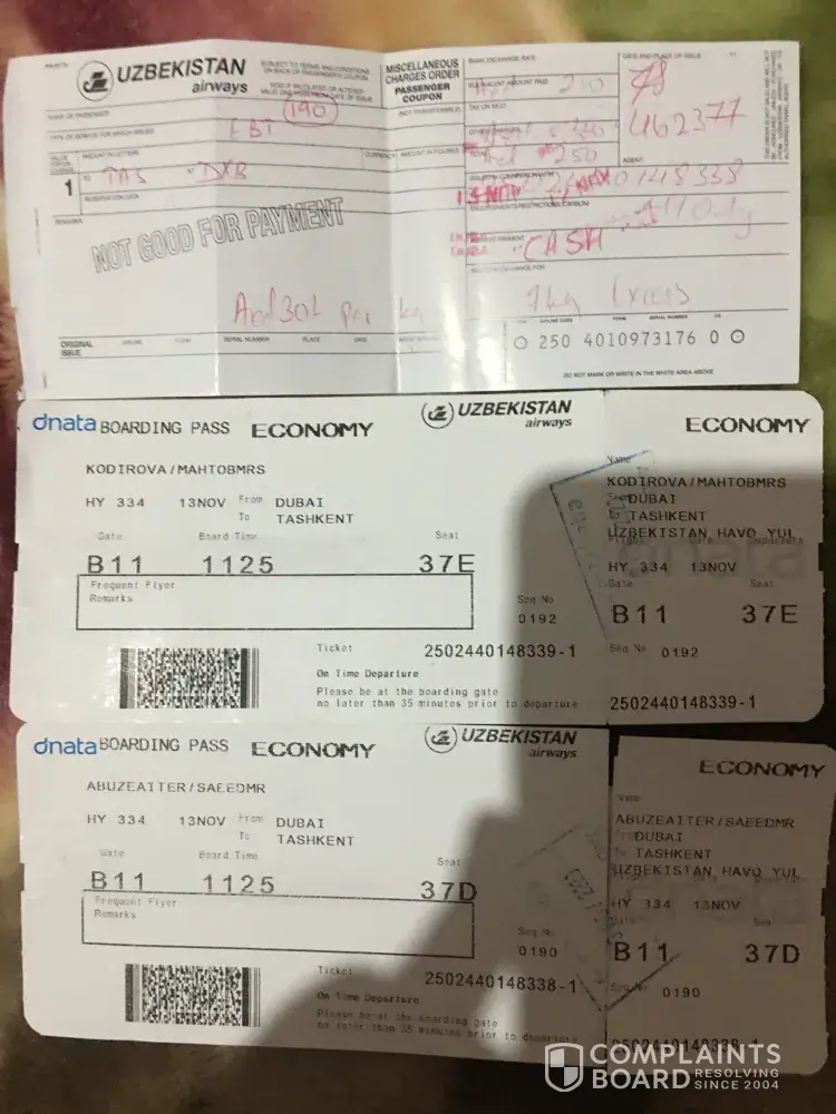Although I explained to the employee present that my delay was not my reason and that the employee told me that we would be at the gate at 10 o'clock and that I came now and my wife has a case of death and a burial, and he did not give the matter any importance and he told me, "This is not my job and I am not an employee at Fly Dubai." I want to meet the employee from flydubai and he called someone and he refused to talk to him and he did not cooperate with me in any way! I told him that the airport had not been called for the flight, for the time of attendance, or for the names of the travelers, But the answer was "that the airport, especially Dubai Airport, Terminal 3, is a quiet airport in which no kind of calls are made from close to the year." This was confirmed by more than one person from the Emirates Airlines company as well. So flydubai refused to change our flight and forced me to pay the full amount of the change of reservation. Even though I paid for two tickets with an excess weight of 3687.4 dirhams. After flydubai refused my compensation, I changed the airline to Uzbek Airlines and paid 2000 dirhams for two single tickets. The travel to Uzbekistan took place at 12:20 pm on 11/13/2020. But the note is that the airport was not a completely quiet airport, and the airport was calling on all flights and the names of travelers, and the counters were not shared by more than one country. As if I was not at the same airport the day before.! I ask you and the esteemed Dubai government to help me and inform me who will bear my loss. This is Fly Dubai or Dubai International Airport. My loss on this day was as follows: