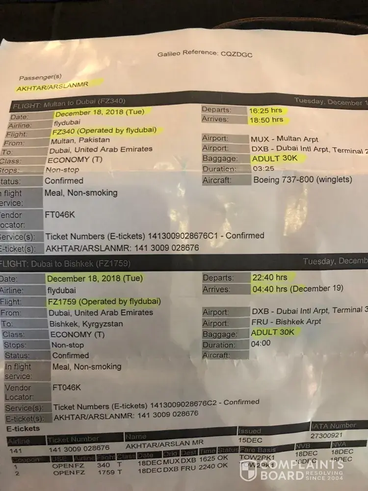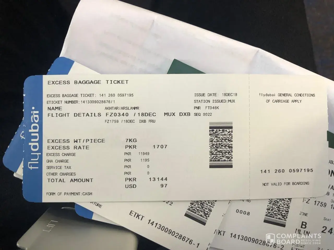 I bought ticket of Flydubai from Arab travelers DGKhan from multan Pakistan to Bishkek via Dubai .The ticket baggage weight is 30+7 kg but at airport system shows 20+7kg and charges extra 97$ illegaly.