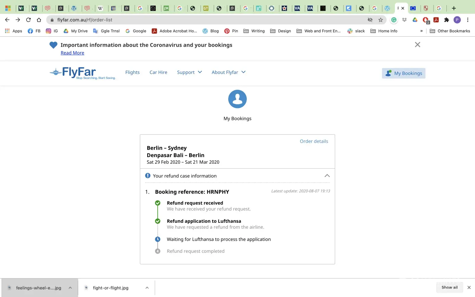 I have attached a screen shot of the FlyFar site when I log in as requested. It clearly states they have not done anything about the refund. This is the same message I received (in email form) from them on 01 December 2020, 15 December 2020, 15 January 2021, and 01 February 2021 - which is AFTER the date Lufthansa paid FlyFar.