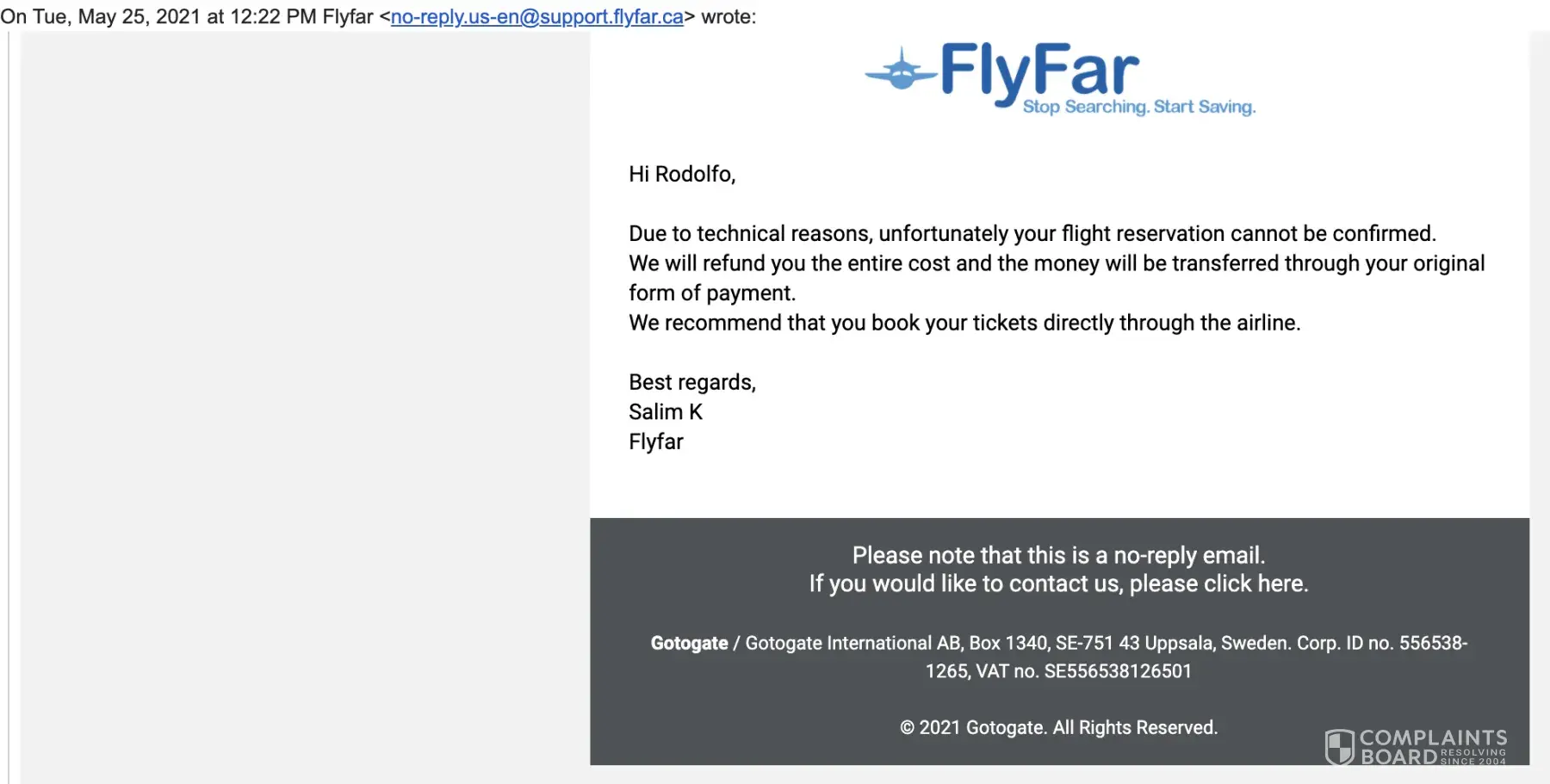 Desired outcome: Refund from Flyfar.