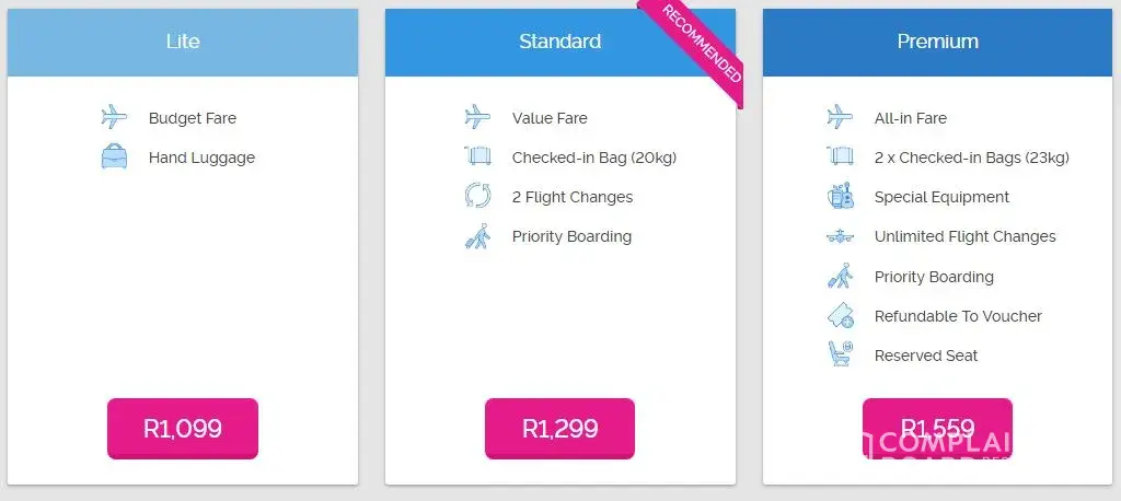 I am not a frequent flyer and rarely make use of the online booking facility, I feel it necessary to draw you attention to a practice that can be considered as misrepresentation. Page 2 of Flysafairbooking site offers three options of ticket: Lite, Standard and Premium. Having selected Lite, no baggage, page 4 then adds the baggage back in with the requirement to opt out, which is what one has done in the original selection of a Lite ticket.