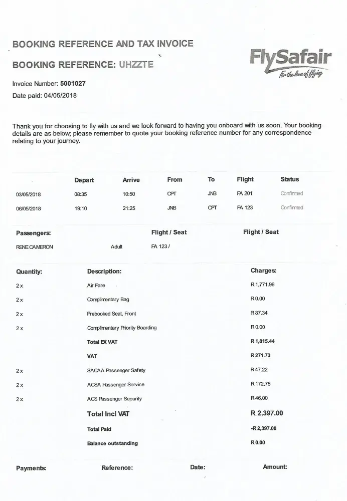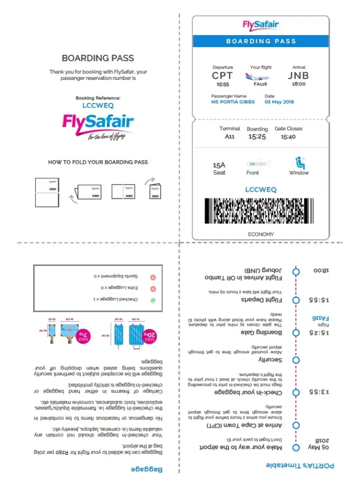 Another incidence was a red eye flight booked for April 26th 2018 at 05:45 from Cape Town International Airport to OR Tambo International Airport, Johannesburg, booking reference: pvrgpc.