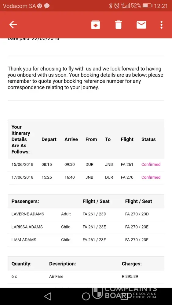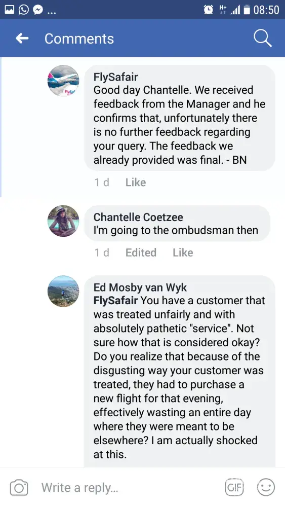 I would appreciate some compensation for these mishaps please. At this point in time I am unwilling to fly with flysafair again as I am afraid these things happen again.