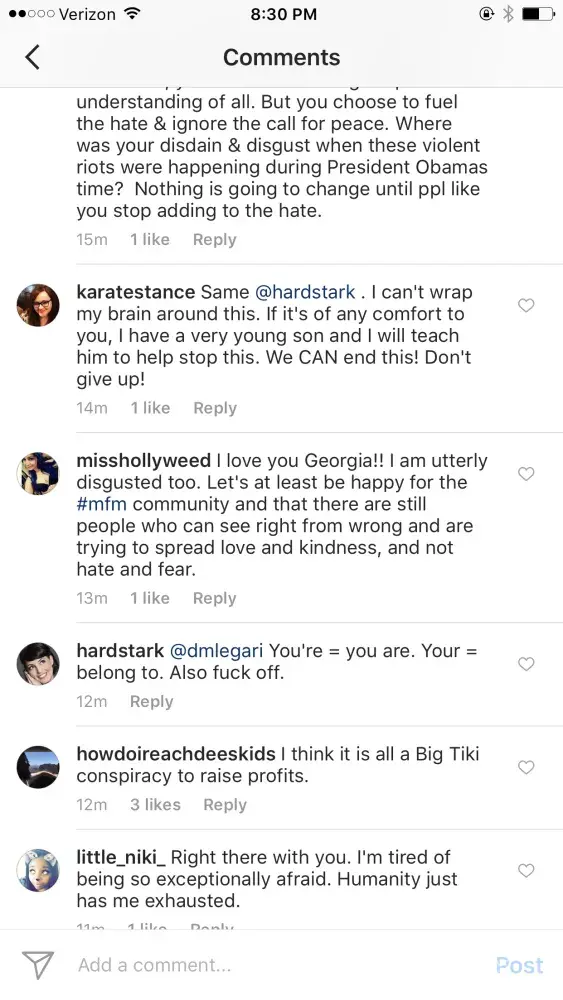 Today, on August 12, 2017 on Instagram Georgia Hardstark posted an article about the riots in VA that happened. Her comments, while understood, were quite hateful and extreme. Being a follower of her IG and a fan, I simply commented that continued hate speech and rhetoric would not help the situation and that we should all do our part to help portray love, peace and understanding. I didn't think it necessary -- with what I'd already said - to specifically indicate that I too was discouraged and disappointed about today's riot.