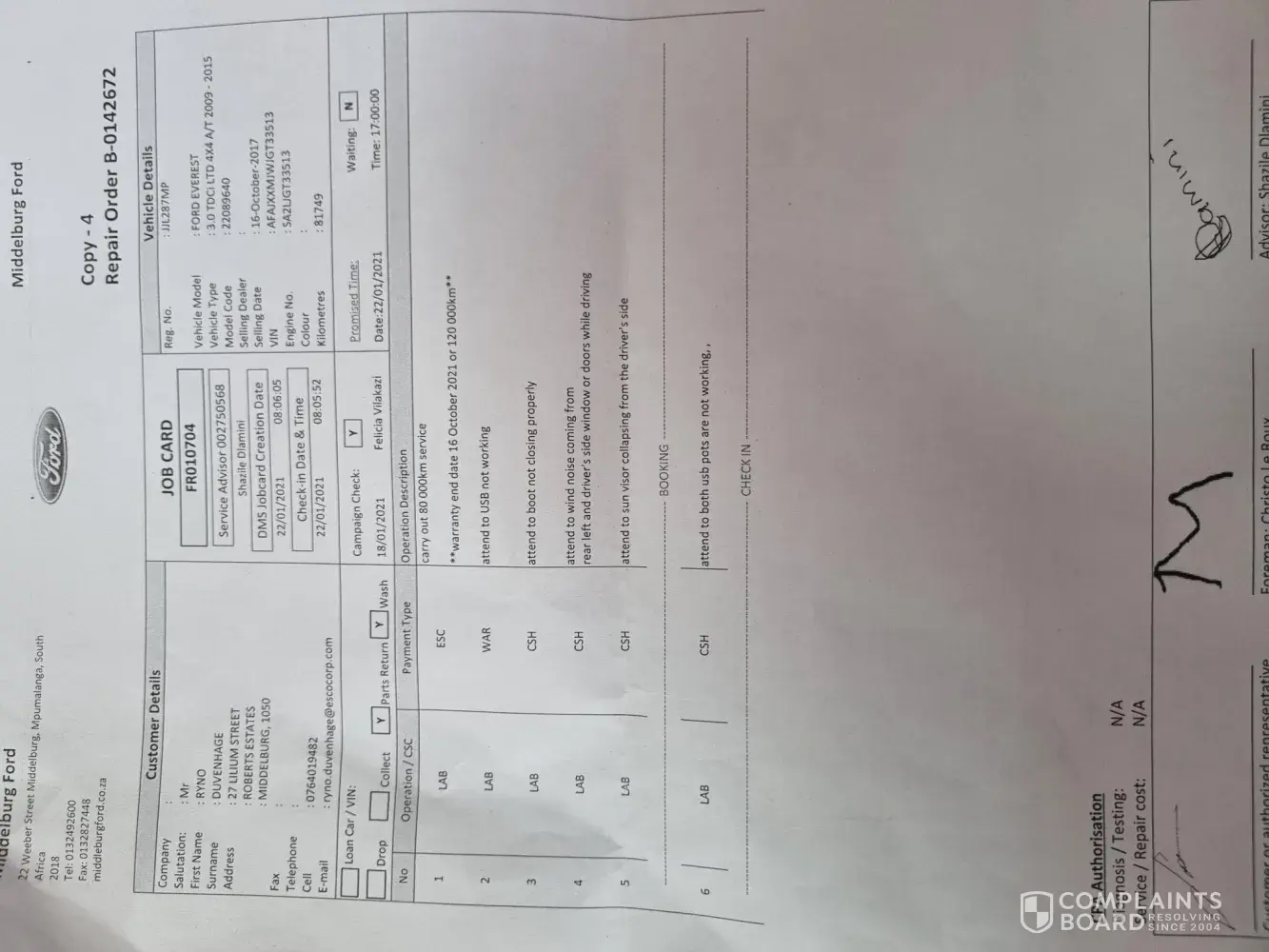 The manager and warranty officer was already out of office, could not raise my concerns with them. I really expect Ford to sort this out for me, issues which were reported at previous services were not fixed properly now I need to pay for work that were supposed to be done first time when issues were raised.