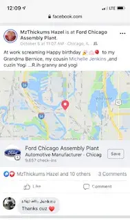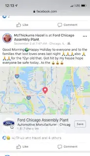 Hello, An employee/temp employee by the name of Sophia Griffin is constantly posting pictures/videos on Facebook of her driving/transporting vehicles from the CN Harvey Rail Yard to the Chicago assembly in Chicago heights. It is very dangerous for this individual to be working for Ford and posting pictures/checking in/recording all while driving as thi...
