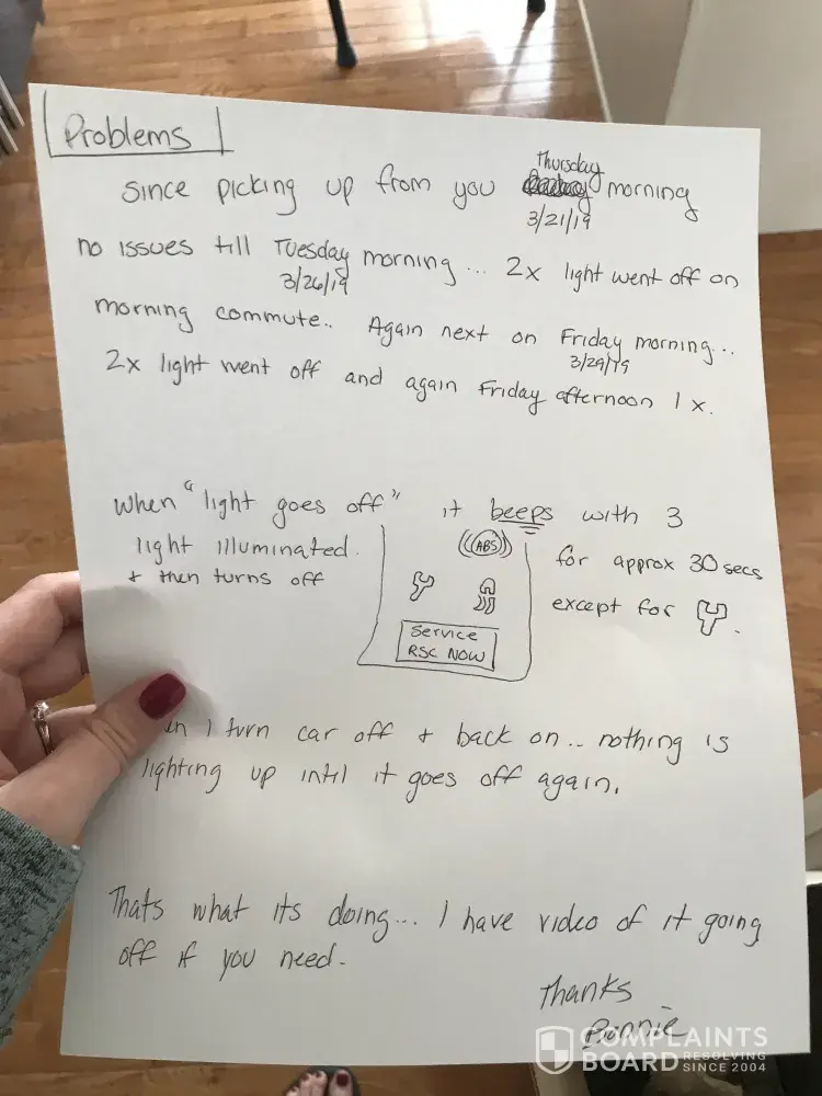 I was having problems with my 2010 Ford Explorer and after bringing it to a few mechanics, they suggested I bring it to a ford dealership to help figure out the problem. I had detailed descriptions about what was happening exactly when and diagrams of the dashboard lights that were coming on. The wrench light, swerve light, ABS light and beeping service ABS...
