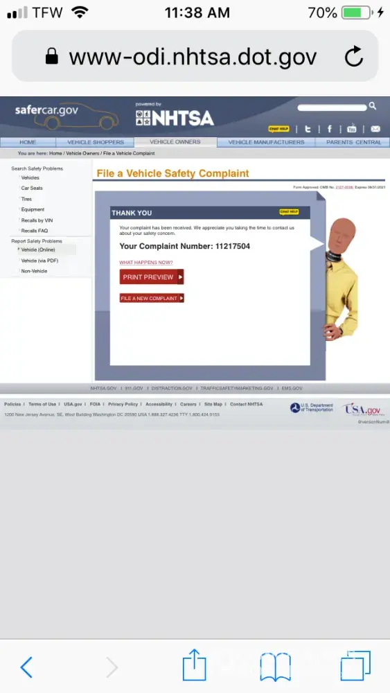 At this time my wife and child are afraid to ride in the car as they are concerned that the air bag may not deploy or the seat belt will not restrain as needed. I am concerned that a serious injury could occur in even the most minor crash.