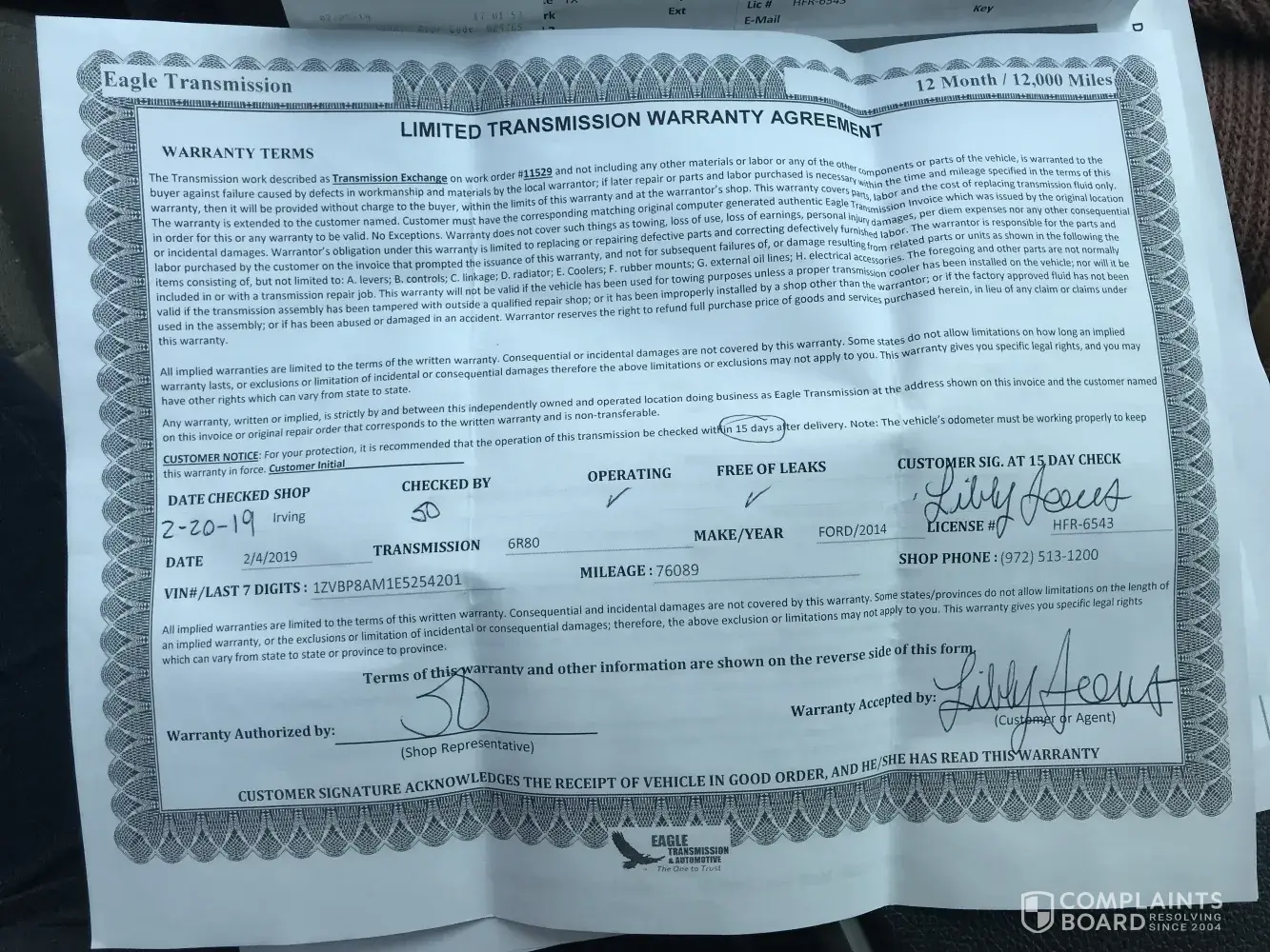 Transmission went out while driving on highway at 60mph. Had to be replaced at cost of $2532, plus several hundred more for diagnostic fees, rental car fees. The transmission should not go out on a 4 year old car! I would like a full refund for all costs involved. I am still paying this car off. Now paying my parents back for the transmission. Not only this, but my radio also went out about a year ago- for no reason! I will never buy a Ford again. Libby Jones, 2521 Sherwood Dr, Grand Prairie, TX 75050, [protected].