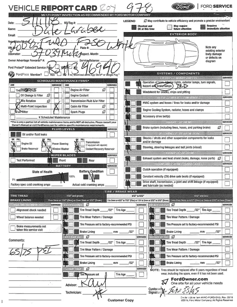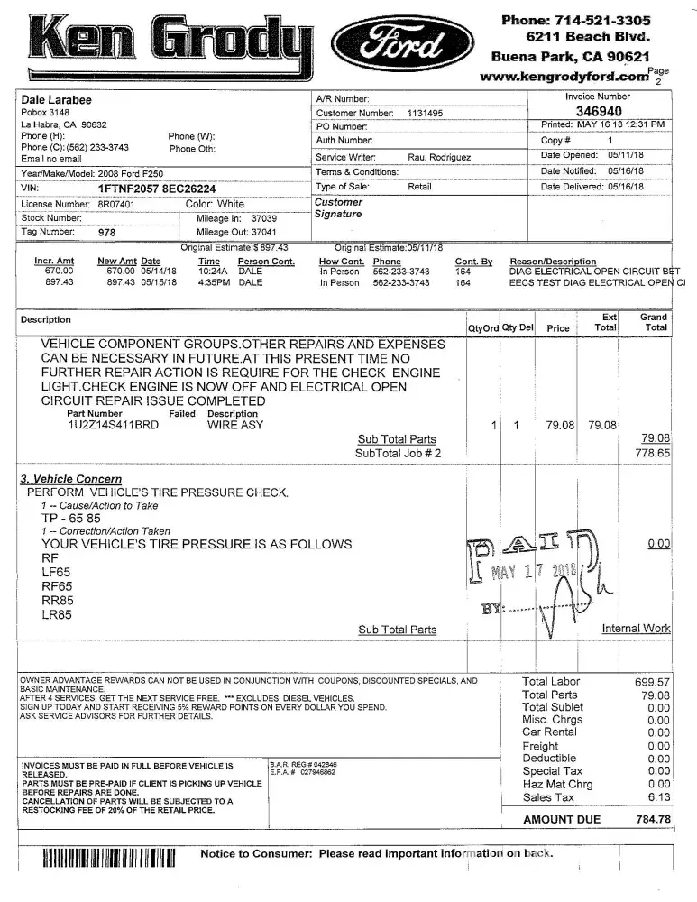 On May 11, 2018 I took my 2008 Ford F250 to Ken Grody Ford in Buena Park, CA. The reason for taking it in for service was the wrench warning icon was lit up solid. Per my request, the service department performed diagnostics to determine the problem.