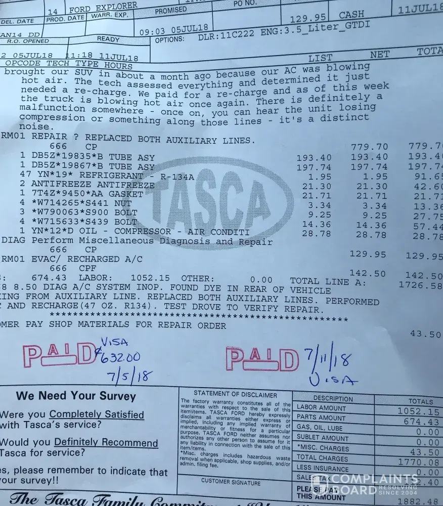 We purchased a 2014 Ford Explorer Sport with around 33, 000 miles on it close to a year ago. Last month our AC stopped working and was simply blowing hot air. We brought it in for service and a local dealer simply re-charged it for $160. A month later, the same issue occurred with the AC blowing hot air only. We brought it back to the local Ford dealer and were told there was a leak in an AC line that feeds the rear unit. Parts and labor were $1, 882 (plus the $160 we initially paid) putting us over $2, 000 for the repair. We don't believe this is a component that should fail. AC's have been around for decades and I've never had an issue with any other foreign or domestic cars. Ford has been of no help. We've written to every executive and have received no response. We are attempting to get the attorney general involved but doubt that will help either. We traded in a perfectly good Jeep Grand Cherokee and inherited a financial pitfall. A 2014 with under 44, 000 miles that has a component of this magnitude fail should be the manufacturers responsibility, not the consumer.
