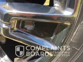 Chrome coming off of wheel, Ford emblem on front of truck is coming off between the O and the R, and a scratch on driver door handle