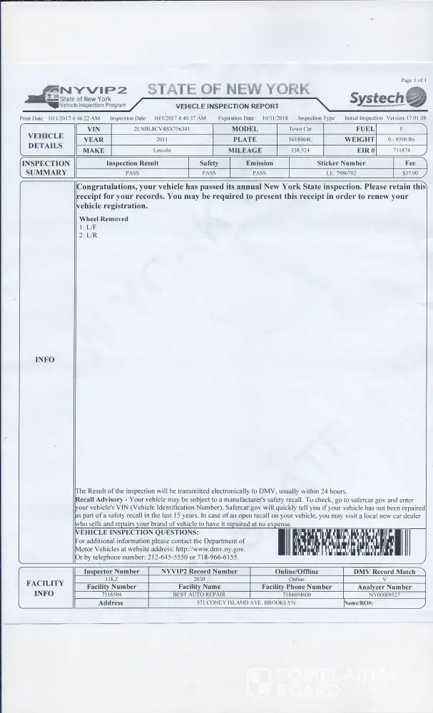 The total repair was $710.00 for the work needed .I asked if all the work was done. They said yes all the work you requested was done and the car has been tested. I have a ford credit card that I use for the repair all the time. I handed the cashier the card and she responded oh! No we don't except this card anymore .No notification, nothing. So I paid, sign the paper work, the release form and left. My car is for higher vehicle which means that I use the car for work this is my job my income, my livelihood the taxi and limousine commissioner in NY city requires this type of cars to be inspected every four months but the sticker will be issued yearly which means my last inspection was done on May 2017 at the same dealers the sticker shows that next inspection is due on May 2018 for a regular car is ok but for TLC the car has to be inspected by seep 2017.