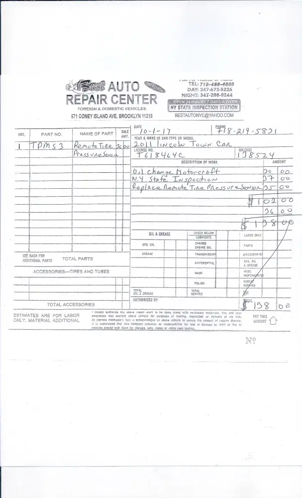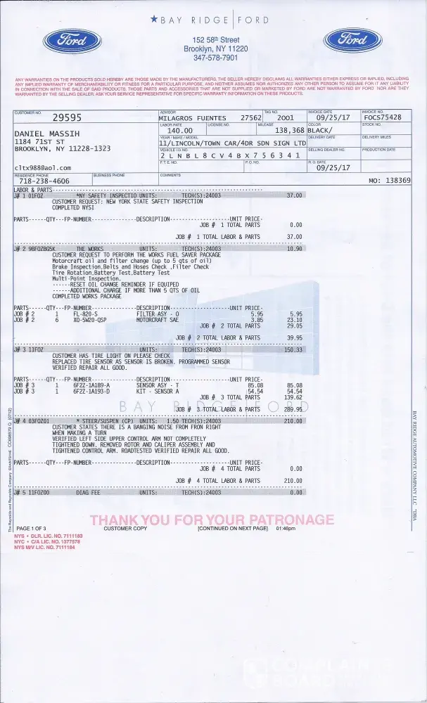 On September 25 2017 I brought my 2011 Lincoln town car to bay ridge ford on 152 58 St Brooklyn NY to do the following repair