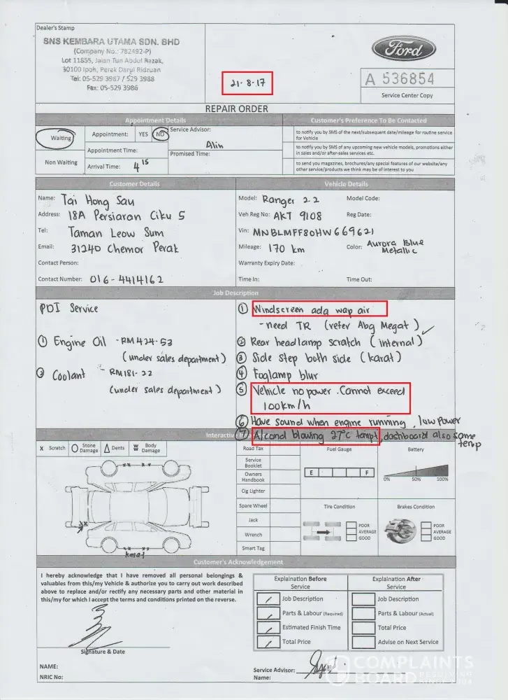 I bought FORD RANGER 2.2L XL LO-RIDER Car model in year 2014, exact date was 16 August 2014. The chassis number is MNBLMFE00FW281416, Engine Number is P4AT1190709.In year 2015, I realised that the car wasn’t function in a proper way, the windscreen and engine had some issues. I sent my car to the workshop – SNS Kembara Utama Sdn Bhd (Ford dealer in Perak State) and seek help from them to find out the root cause. I have been sending my car to SNS Kembara Utama Sdn Bhd for almost 3 years [protected]), same problem still existing and all the technicians failed to solve it out. Even the director (Syed Nasrul Azmi) of SNS Kembara Utama Sdn Bhd failed to provide solutions and good explanation to me, I am wondering how SNS got the dealership from SIME DARBY or Ford Motor, the quality is so ……….(I can’t describe it). I attach copy of repair copy for your reference, how ridiculous Ford Motor failed to repair one minor issue after 10 times trying!