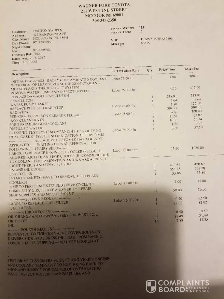I bought a 2005 Ford F250 Powerstroke superduty from Wagner Ford on April 28, 2017 with the assurance from the salesman whose name is Chase that it had a brand new oil cooler and EGR cooler system on it with a warranty after the 2004 F250 I had first test drove was spewing oil from the passenger side of the motor when we returned from the test drive. On August 20, 2017 my 2005 F250 Powerstroke stranded me in Alma, Nebraska with only 14, 000 miles being put on it since it was purchased and had to be towed to Wagner Ford in McCook, Nebraska to be repaired, since I was still under the assumption it was under warranty. They quoted me $2, 200.00 dollars total to fix it and get it running again. From August 21-25 Chris from service dept. at Wagner Ford has called me numerous times stating they believed it was the water pump, the radiator, the fan clutch and finally the EGR and Oil cooler system that were bad. I approved them to do work on the pickup except the EGR and Oil Cooler which I asked if they were under warranty since my salesman had assured me during my purchase that those parts were under warranty and brand new. Chris said he would check and call me back. Chris called me back a couple hours later and informed me that they were not under warranty and my bill was now going to be between $4, 700.00 to $5, 000.00 dollars total after the oil cooler and EGR systems had been replaced with tax and labor. So not only was I lied to and mislead to believe that the parts were under warranty when I purchased the vehicle I was also misled on my quote to fix the pickup. There is no resolution in sight and they will not allow a payment plan to be set up but did suggest that I come in and fill out a credit card application for Ford Credit Services which I could use to pay part of my bill if I were to be approved. During the time my pickup has been in the shop I was able to rent two cars from them both 2016 Toyota Corolla's on August 23rd of 2017 I hit a deer going to work at approximately 6:15 a.m and killed it which also damaged the car. It broke and cracked the grill and bumper cover of the vehicle. The Harlan County Sheriffs office was disbatched and took report of the damage and all information. At 8 am on August 23rd I informed Wagner Ford of the accident and asked what they wanted me to do. They wanted me to bring the car back and exchange for another. I returned the car and picked up the next rental and went back to work. On August 25th of 2017 I recieved an email from State Farm addressing myself Dalton Swopes that they had received my claim for the rental car which I did not send. Wagner Ford in McCook, Nebraska took it upon themselves to claim my name and send a claim into State Farm on my behalf. Also on the 25th of August Wagner Ford called and requested their rental car back so I returned it and they wanted me to pay their $500 dollar deductible for their dealership insurance to pay for the rental car damage knowing full well that they had already fraudulently sent a claim to State Farm claiming to be me to cover the rental car that was damaged from the deer on August 23rd of 2017.