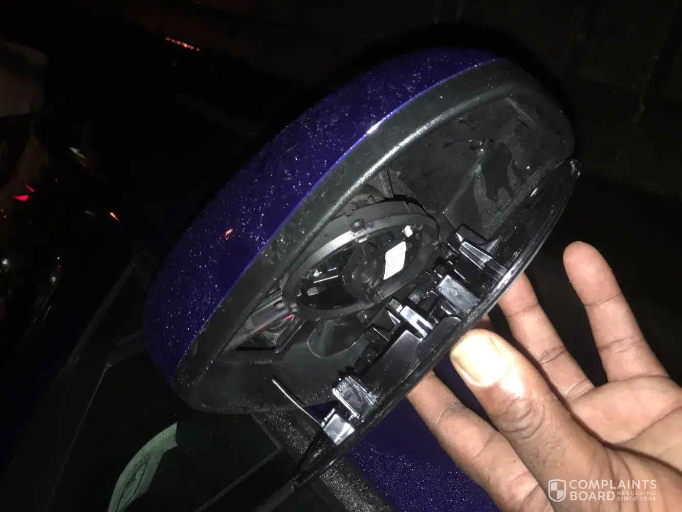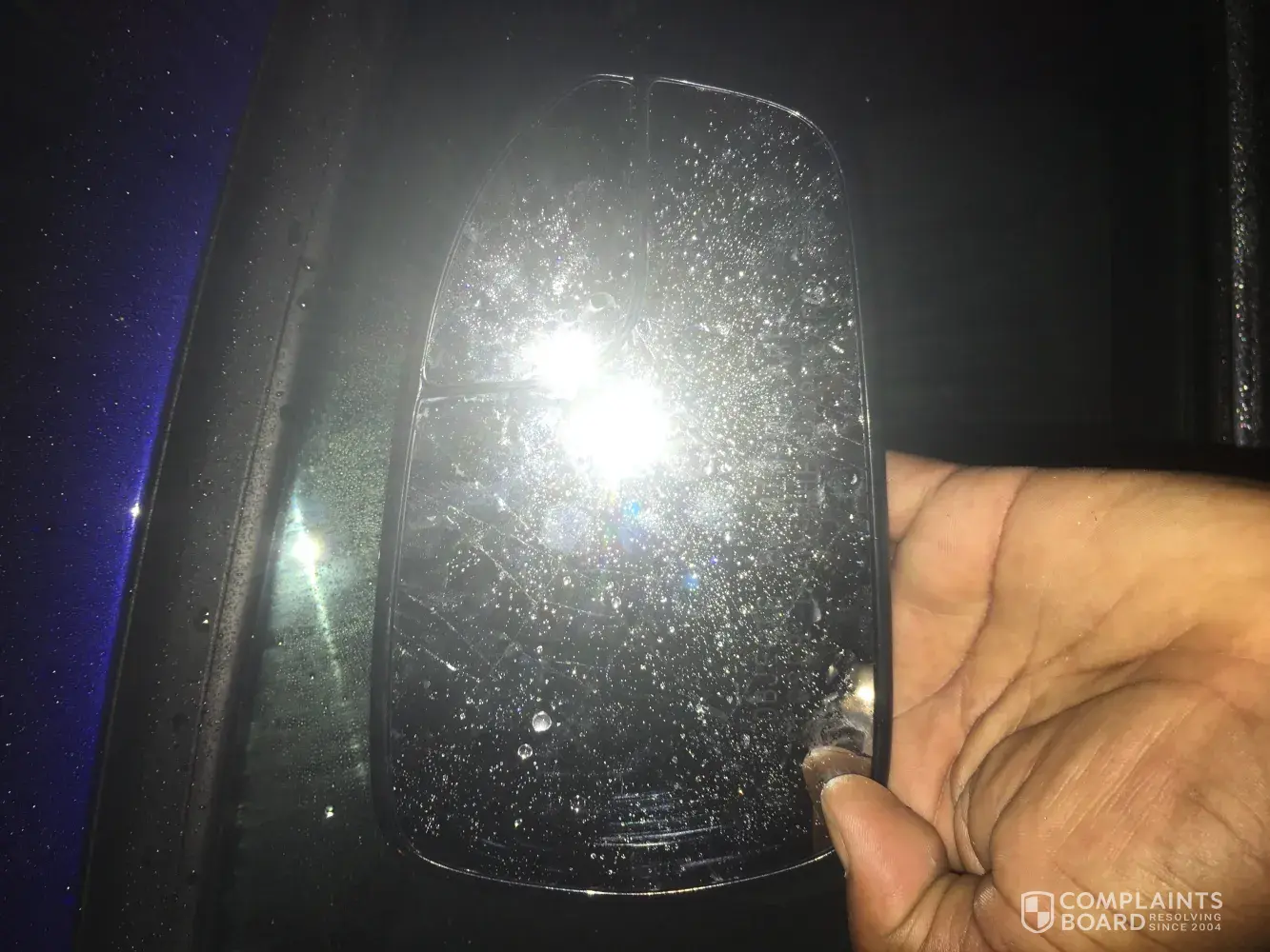 Originally my passenger side mirror was stolen. So I purchased a brand new mirror and my husband went in on July 5, 2017 for (paid) installation and " The Works". Mirror pops out onto street, cracks and I went back today 7/14/17. Brand new mirror " installed again. My husband goes to move car and when he flips open mirror, glass pops out AGAIN!