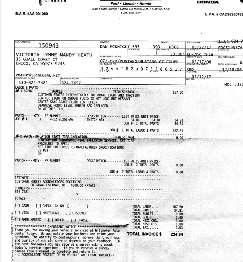 Purchased new 2007 Ford Mustang Shelby from Whittmeir Ford in Chico, CA as well as extended warranty. Complained about the brake fluid low indicator coming on every time I brought it in for service. They kept telling me to ignore it. I finally couldn't stand it anymore so I brought it in again. They tested it and it was bad. Now the vehicle is not under warranty and I had to pay $224.84 for the labor and part. They were able to pull up a prior record of my complaint from 2011, when it would have been covered under warranty. I mentioned it every time I brought the car in for service! I believe this should have been taken care of years ago when it was under warranty and I wouldn't have had to pay for it.