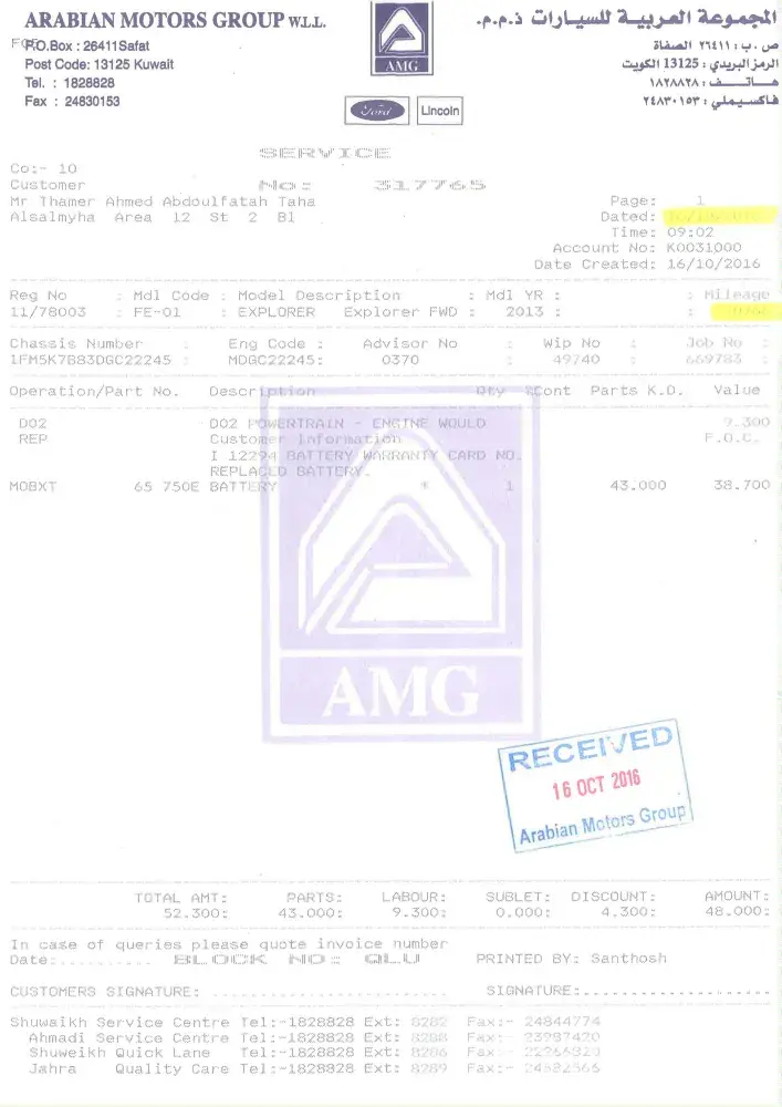 My name is Tamer Taha, I own Ford explorer model 2013 in Kuwait under agent warranty "Arabian Motors Group Co. till 2018", From day one I Maintain all the regular maintenance/services with the agent and never missed any routine service/maintenance.