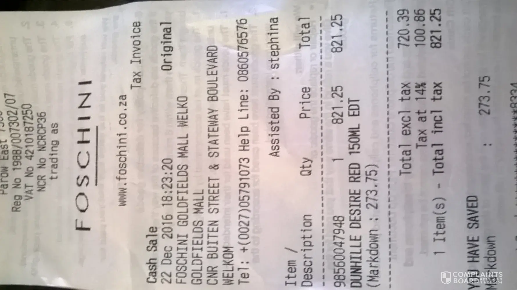 On the 22nd december I purchase above mentioned item at your foschini goldfields mall welkom c/n buiten and state way boulevard street. I find out that the perfume I bought was the last on stock and I was told that there were no taster available which was not a problem for me, l purchase it anyway with markdown price a bargain I thought that time,