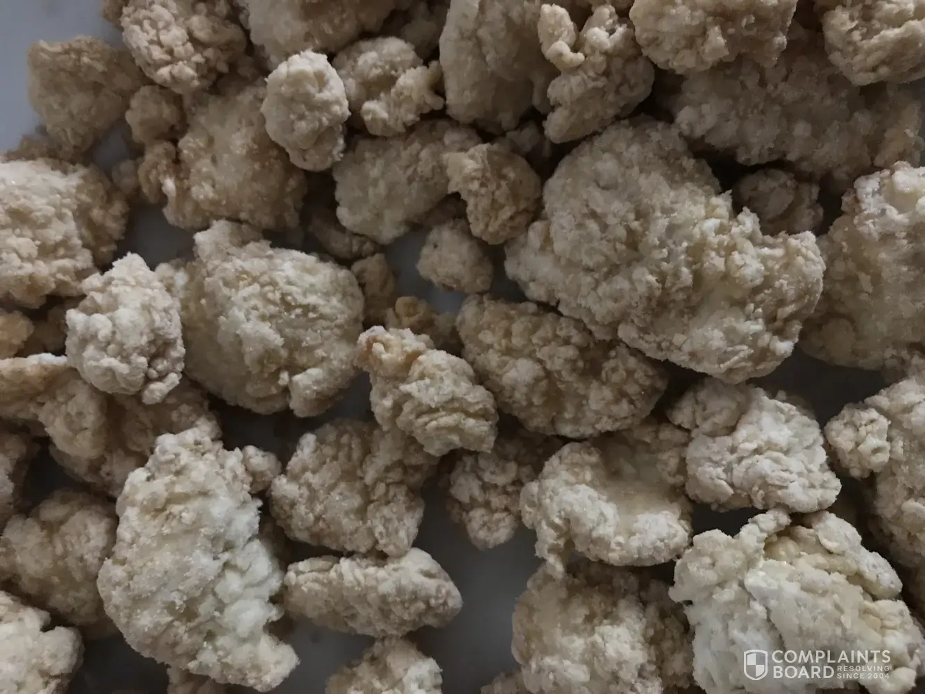Some actual chicken nuggets and lots of "batter" nuggets. In this 1 1/2 pound bag there were actually only 20 peices of battered chicken. This for $8.99! 6 servings? Hardly. Very disappointed. Always thought of your company as trustworthy. I'll know better from now on. Did not get what I paid for.