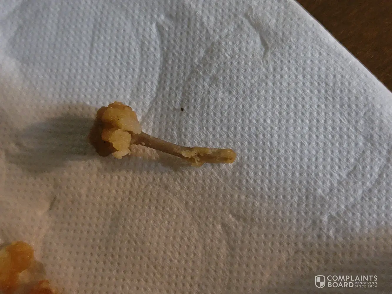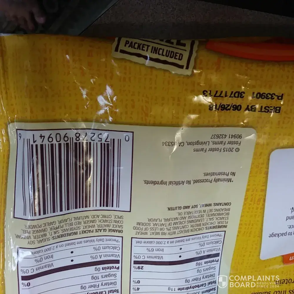 I made a bag of your Foster Farms orange boneless chicken that's supposed to be fully cooked about an hour ago for me and my three and a half year old and a. I've bit into one of these boneless pieces of chicken and had a bone in it that cut my lip and I'm wondering what I can do about it now I've taken pictures and I need to know who to call