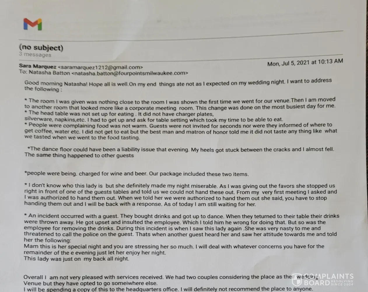 I signed a contract last year however due to the virus we postponed our wedding for June 19, 2021. Our Sales Manger was Natasha Batton. Before I proceed with my complaint I want to let you know of the steps taken prior to filing this complaint. On the morning of June 20, 2021 I was eating breakfast and a young lady from the front desk approached us (my...