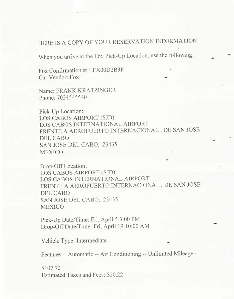 I reserved a car with Fox Payless online and my reservation said the estimated cost would be 152.00 for 1 week's rental, including tax.