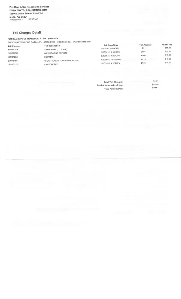 I had only 2 days of tolls ($5.63) out of less than 4 days car rental (after 9:30PM 7 May and returned car before 6:00PM 10 May 2016) yet wrongfully charged 5 days of admin fees ($75) for an additional $81 of fees on a $83 4-day rental.