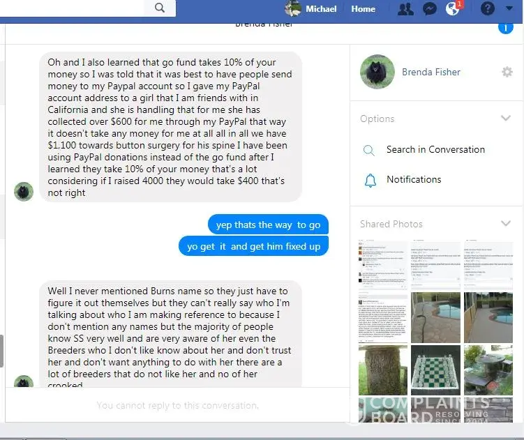Brenda Fisher is a phony on face book she abuses animals & killed her own pet Buttons over sedating him with medications while she collected funds from him thru Go Fund Me and other ways $2600.00, She has attacked good dog breeders, users on face book & other dog breeds calling Chihuahuas Rats, In this scam report we will prove that she is indeed a serial scammer, fraud, phony with a false face book name and narcissistic sociopath with narcissistic sociopathic behavior in attacking animals & her make believe husband Danny Fisher for attention. She ask funds for her dog Buttons and kept the poor dog on so many drug medications he died of a seizure, Button never had any surgery he suffered great pain, She claims a breeder sold her a bad dog with bad genes, When fact she was feeding this dog pork, medications and other poison carcinogens killing him slowly because she was not happy the way his appearance looked as he aged, he was only three years old when she killed him, She was over dosing buttons on drugs like Trazodone, & Robaxin keeping Buttons sedated most his life, On her personal wall she has called dogs stupid and other nasty names.On a web page she created, she slander Chihuahuas suggesting beating one over the head with crow bar. She is a Charles Manson fan, loving this serial killer showing almost certain proof she does have narcissistic sociopathic behavior problems. Please take our advise and block this very dangerous criminal, animal abuser and con women from your face book, This person does not deserve any animals in her care, Brenda Fisher also has relations with Art Smith, Dominick Tambone, Randy Boles alias Randi Mee from Foxies Fund Inc. in Norcross Georgia. and Foxies Fund face book group that has been proven frauds. Most that know Brenda Fisher on face book knows she tells stories that have been fabricated, In this comment for scam report we will show evidence that Brenda is indeed a breeder & scammer, She did ask funding help for her dog Buttons which she killed with medications & kept the money to buy a new house, People that donated to this scam artist and narcissistic sociopath are just about stupid as a box of rocks, Open your eyes people there is no such women as Brenda Fisher or husband Danny Fisher, These stories are fabricated by this narcissistic sociopath that loves attacking others on Facebook & playing people for fools, She really is one that can pull the wool of the publics eyes, with collecting from her dog Buttons for a down payment on a new home not long after the Buttons Funding Scam as this report shows. She also owns rental property but needed funding for her dog, that's fraud, You been scammed if you donated to this nasty witch & to top that off calling little Chihuahuas Rats this is no dog lover, She loves possession, yours if she can scam you out of them with her many fake face book accounts she creates, BEWARE OF BRENDA FISHER ON FACEBOOK !