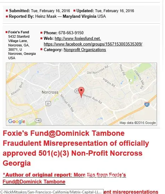Dominick Tambone owner of the fraudulent 501c3 Inc funding group from Norcross, Georgia & facebook group Foxies Fund has pull off ripoffs and many fraud schemes with his accomplice partner Art Smith, 60 to 80 other criminals are also involved in the bogus collection of animals not injury or have injuries and suffer while these clowns lived off donations, Foxies Fund face book group was created after Dominick Tambone friends Casey Holt & Steve Ereth two male lovers had a dog named Foxie that was sick and Vet bills exceeded 16, 000 dollars, the dog suffered while Casey & Steve collected funding help before Foxies Fund was created. No Vet billing has ever been produced to show, These two men Casey & Steve own expensive sports Crossfire cars and love spending time with each other in Hawaii laughing all the way to the bank as funds poured in from scamming others. Although they say they could not afford Vet Bills they spent 5000.00 on their wedding as the two lovers drove off in their expensive sports car at their wedding. Earlier before all this Dominick Tambone became involved with the two men and created a face book group call Foxies Fund claiming he was wanting to help animals shortly his Go Fund Me & Your Caring Inc accounts was soon froze due to fraudulent activity & asking 10, 000, 000 Millon dollars in donations, Later prison con Randy Boles, convicted thief Lilian Garrick & Liz Harrison join the team of scammers, not long after they joined the crime family Beverly Murphy alias Art Smith a serial scammer joined the crime family also making this organized crime, We have proof off people ripoff on recurring donations they did not ask for & was only donating on time, while money kept pouring from the victims bank accounts, we have proof of individuals being attacked inside the first face book group when they question Art Smith or Dominick Tambone for being legitimate as well as others attacked or wrongfully blame for reporting them as frauds & scammers, No legitimate 501c3 would act in any form or fashion as these fraudulent clowns have, Before you ever donated to a organization like this one do your homework to many red flags are flying here . When Dominick Tambone Go Fund Me was frozen for fraud he begged his members to email the Go Fund Me Inc . to have it open, his attempt to do so failed the Man was found as a fraud and scammer. One person Andreal Michelle Damron with a dog named Daisy was ripoff by Art & Dominick using her dog, asking for funds without consent to do so, Art was caught and paid off Andreal Michelle Damron to keep quiet, Ryan Thomas owner of freeanimaldotor. org paid Daisy's bill in full, the screen shots prove this be on a doubt of question ? freeanimaldoctor.org is a very honest 501c3 helping many animals, Art Smith and her gang has attacked them and many other legitimate charities