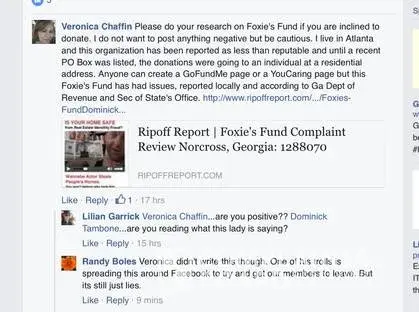 There are way to many Shady Characters that play a roll in the Foxies Fund collection Army to even trust these individuals with donations going thru their hands, Like the Cyndi Pomlover broken dog leg case, really who in their right mind would donate to such a bogus name and scam set up, The Tiffany Tadlock Lucy case also took our investigation Team eye Art Smith creating a Facebook in the name of the dog Lucy Tadlock, Thousand was collected off Lucy, But now she has up and disappeared with no updated post on her condition, When Art Smith, Dominick Tambone, Randy Boles or Lilian Garrick was questions about certain clients, They always used this Michael's guys name, calling him a troll and the person questioning a troll or saying he was attacking their group, When fact Michael did not know these people, Any legitimate ran 501c3 if asked questions about where there donations go to should be happy to forward information.Art Smith, Lilian Garrick, Randy Boles, Cynthia Foster alais Cyndi Pomlover are all Shady Characters, including Foxies Fund newest scammer revial Sarah McGuire alais China McGuire which has not one, but two accounts in the new Foxies Fund group she also runs a Facebook page called CHinas Magic Massages that looks like the sex trade business, The first group Art Smith claims to close it down to have a public group, when all she had to do is take out members down to 4999 members in the group and change the Facebook setting to public, She close it down to create the new group under her name Art Smith, The first group was created by Dominick Tambone yet another very shady and suspicious move from this Norcross Georgia based 501c3 fraudulent organization. Screen Shots provided prove they are very Shady Individuals