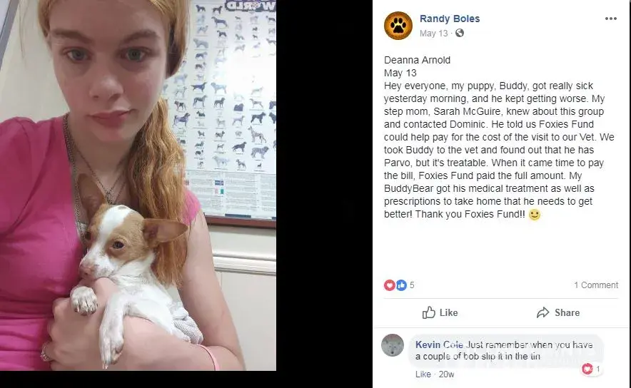 Randy Boles a convicted felon helped China McQuire real name Sarah McQuire and Sarah's step daughter Deanna Arnold well known scammers to our Fraud Investigation Team, pull off a collection scam for Art Smith and Dominick Tambone Facebook group Foxie Fund for a quick cash scam Randy Boles was also involved in many other bogus sick pet set up scams in the Facebook group Foxies Fund . If China( Sarah ) McQuire and her Step Daughter is making $60.00 a hour in the self employed massage business CHinas Magic Massages, Maybe their pets should not be so sick all the time, like Deanna Arnold's with the bogus parvo case that was posted in the Foxies Fund Facebook group and Randy Boles Facebook wall, now we can prove the Dog Buddy is still very much alive and has grown.
