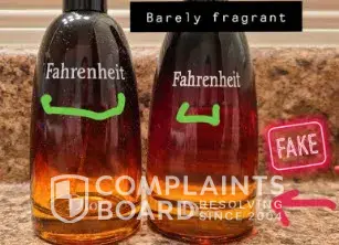 I've purchased from this reseller, more than 5 times in the past. Recently, I ordered Fahrenheit and IMMEDIATELY knew it was FAKE faux bogus counterfeit. See attached photo where the AUTHENTIC bottle is on the left. Fake bottle attributes (1) spray nozzle is different, (2) fragrance is weak AND different, (3) Wording on front in a tightly-spaced font, (4) glass bottom is thicker AND curved on edges inside where contents reside, (5) wording on the rear describing combined scents does not exist on ANY year's worth of purchases.