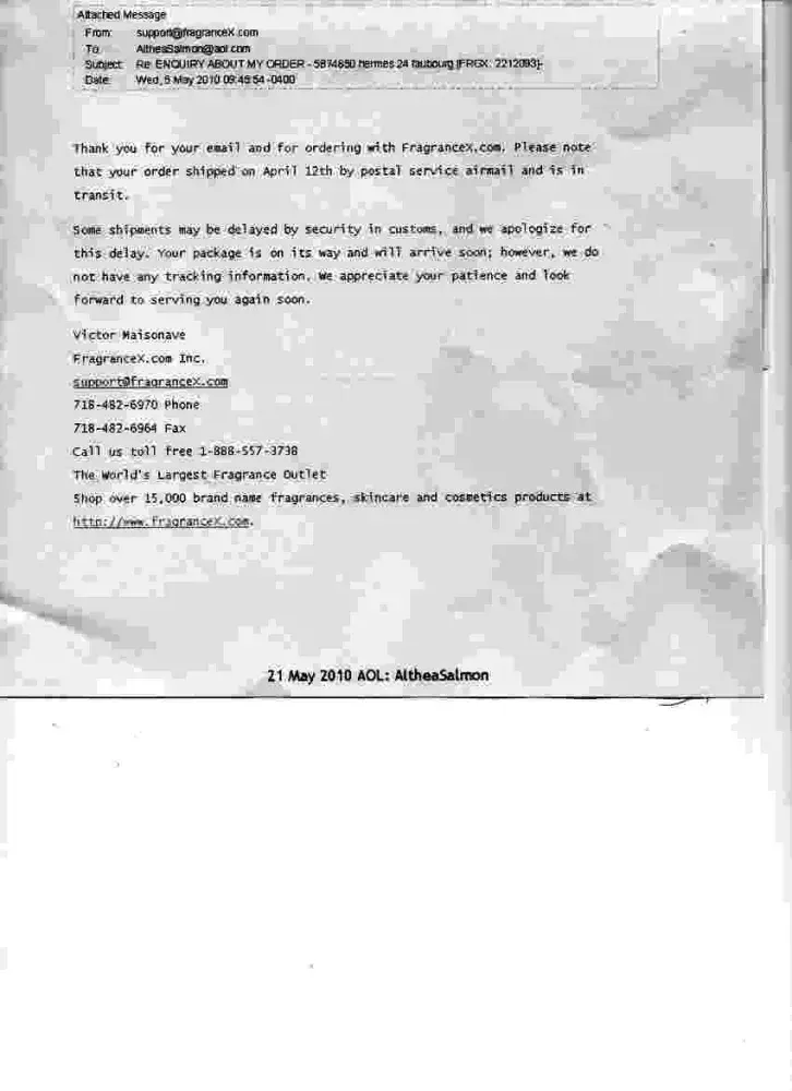 This company is total scam, DO NOT BUY anything from them. I ordered some perfumes (worth $122) on 3rd June 2010 and they have not arrived yet, I tried to contact them with many emails but no reply. I searched my post office register with post office staffs and they found nothing arrived in my name from FragranceX. Once they sell, they never response to their customers which is a sign of fraud. Also they do not keep any shipping receipt/information of packages w/o tracking number which is very suspicious.