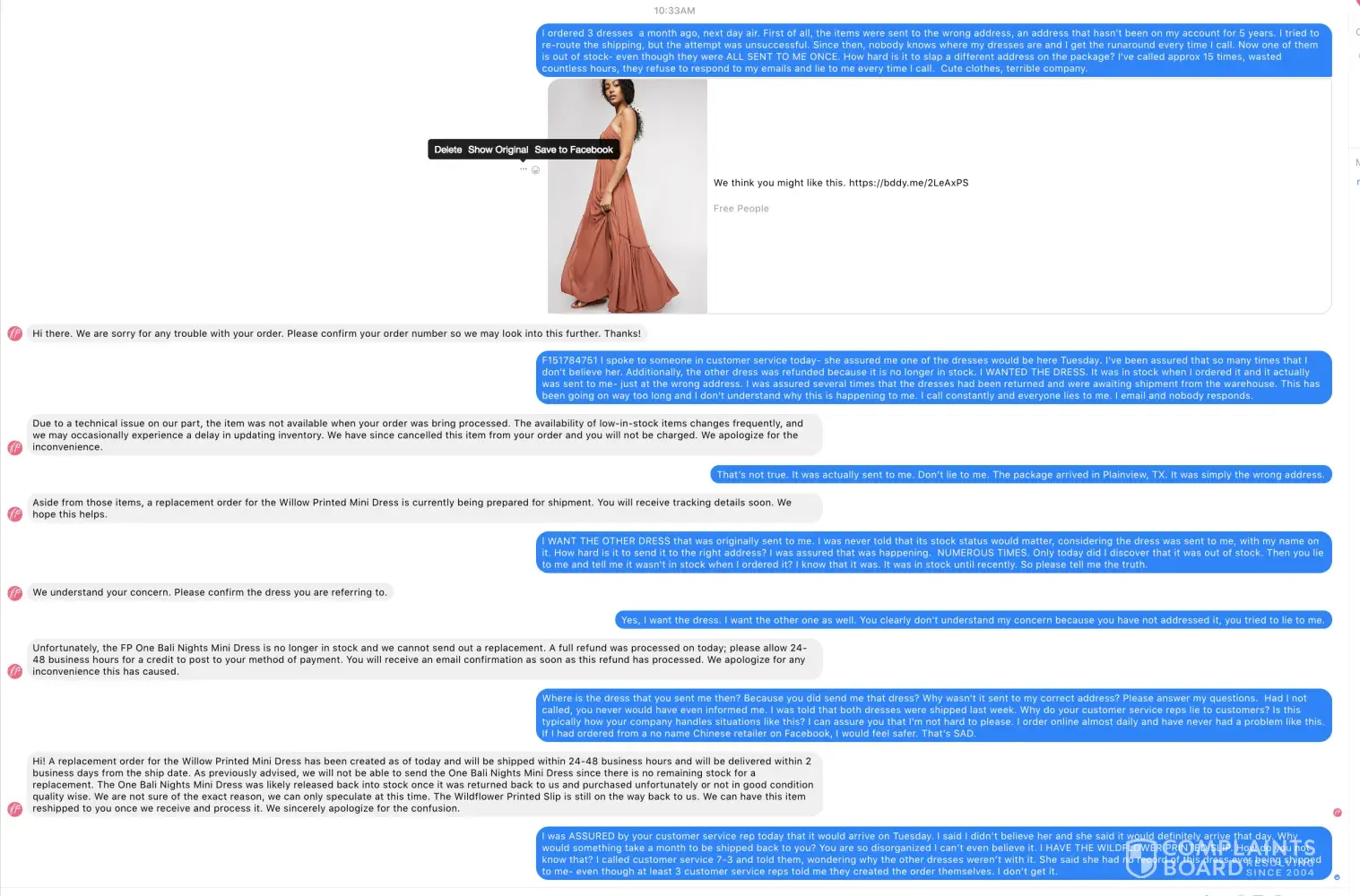 I ordered 3 dresses 6-15-18, next day air. I was informed that it would arrive 6-19-18, but was heading to the wrong address- an address that hasn't been on my account for almost 5 years. Immediately after receiving the shipping confirmation email, I called FP to see if it could be stopped. They told me we could submit a reroute request but I would have to do that separately for each item, even though they were ordered together! So I had to wait for each email, call customer service and request a re-route. None of them were successful and the items were returned to sender. I called over and over and over asking where my items were. I was first assured they would arrive any day, then told that there was no order for them, then told that one of the items wasn't in stock the day I ordered it, so it wouldn't be arriving. Um, really. The item was shipped out! It obviously was in stock. 7-3-18, I shockingly received one of the dresses. I called to see where the others were. The customer service rep had no record that the dress I received had ever even been sent. I hoped that the other two dresses would also arrive, but they didn't. She told me she created a new order and would have them sent ASAP- at that time, they were both in stock. Yesterday, I sent another email- received no response. I've sent numerous emails, only one of which has received a response. Today, 7-14-18, I called yet again and was finally refunded my money on the dress that was "out of stock" and was told the other remaining dress would arrive 4 days from now. I actually wanted the dresses so I'm really unhappy about this "resolution". FP's customer service via FB Messenger told me today that the dress I've already received is in the process of being returned to them and once it was received, they would send it to me immediately. Keep in mind, I ordered this dress a month ago and received it a week ago. They have no clue.