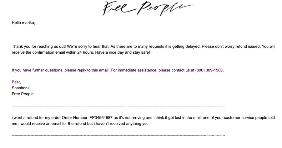 I ordered several items from FreePeople online shop. The shoes I ordered were way too small and the jewelry was rubbish and looked nothing like the pictures on their website. I contacted their customer service and asked for a refund. So I returned everything. It took almost two months for me to finally get a refund and the only reason why I got it was that I opened a dispute through PayPal. Absolutely terrible customer service. They even threatened to not issue my refund until I closed my case with PayPal. I'll never order anything from them again!