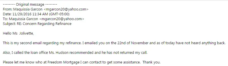 Two weeks ago I emailed Yoland Jolivette. We spoke about the issue over the phone and she said she would investigate and contact me in 10 minutes. It's been 1 week since she has communicated with me. I have sent 3 emails and no reply. I called the new Loan Officer Edward DeWald two weeks ago and left a message. Still no replies. Each time I speak to someone I have to start all over. The customer service I have received from employees at Freedom Mortgage is repulsive.