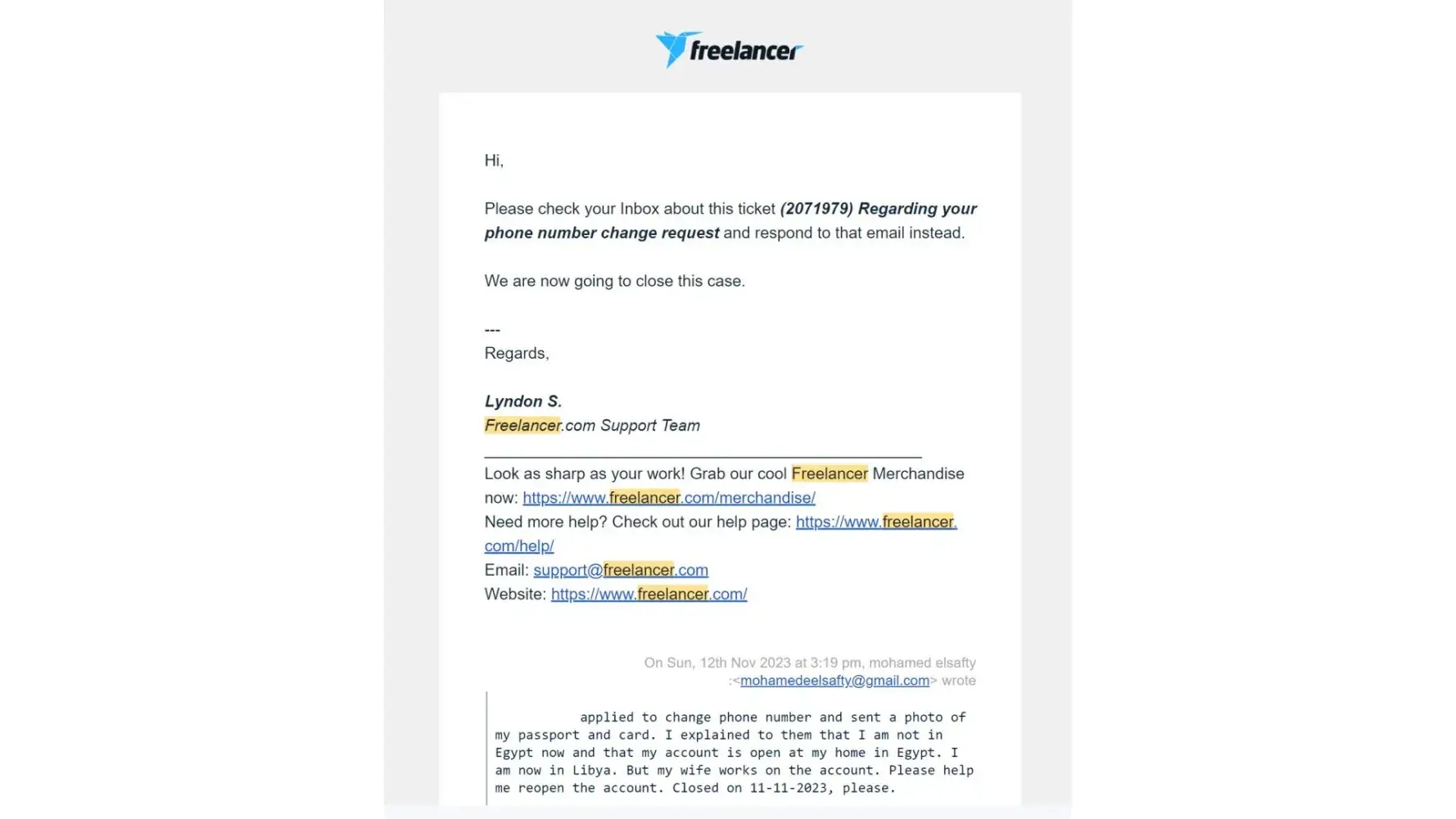 My wife and I work on the freelance website on the same account. She is in Egypt and I am now in Libya. We changed the phone number because we no longer have it. I requested verification of my passport and ID, but my account has been closed.
