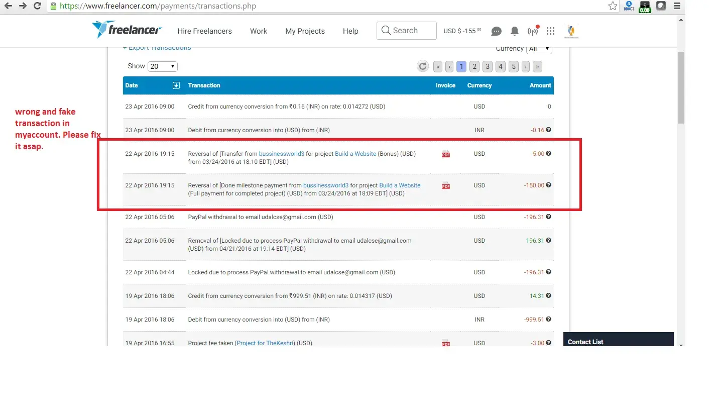 Now 1 month later freelancer.com reversed the $155 and my account has -155 USD. When I asked to freelancer.com, they said my employer did some fraud. When i asked my employer did fraud so why you taking amount from my account. Then freelancer.com never replied.